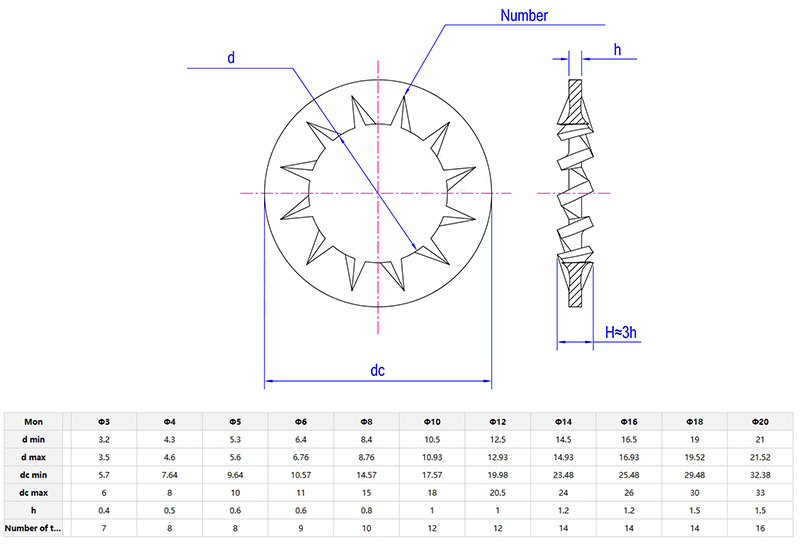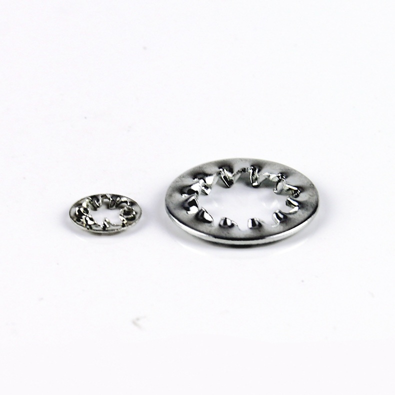 Thevnútorné zuby zúbkovaná poistná podložkamá vo vnútri zúbkovaný tvar pre zvýšenie trenia a uľahčenie vystuženia. V prípade vibrácií vplyvom vonkajších síl sa dá lepšie uzamknúť. Na výber je množstvo materiálov a môžete si vybrať vhodný materiál podľa prostredia použitia a špecifických potrieb.